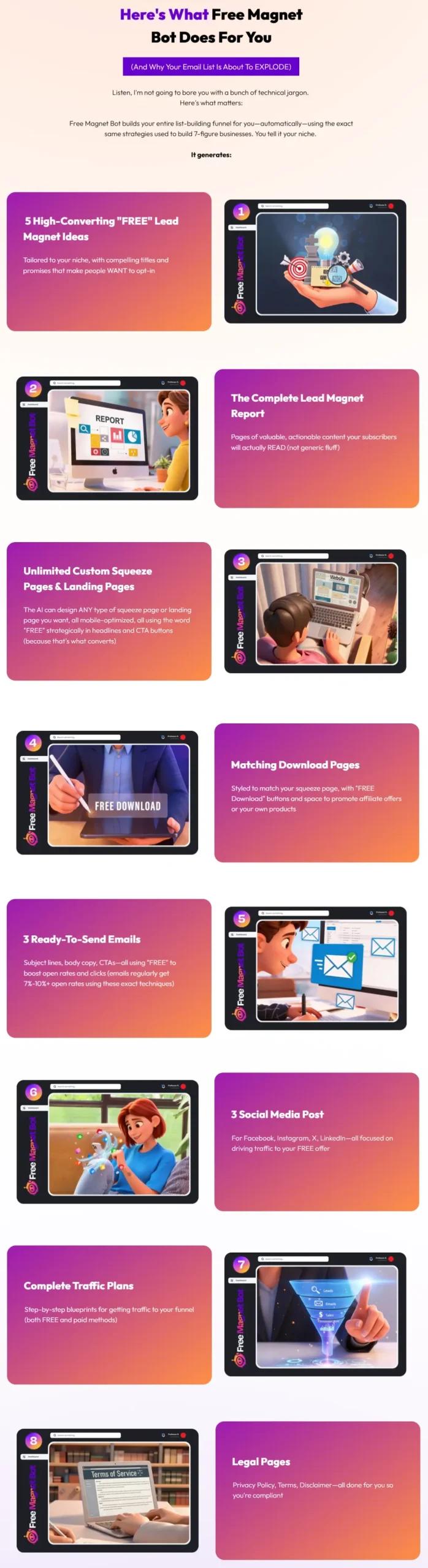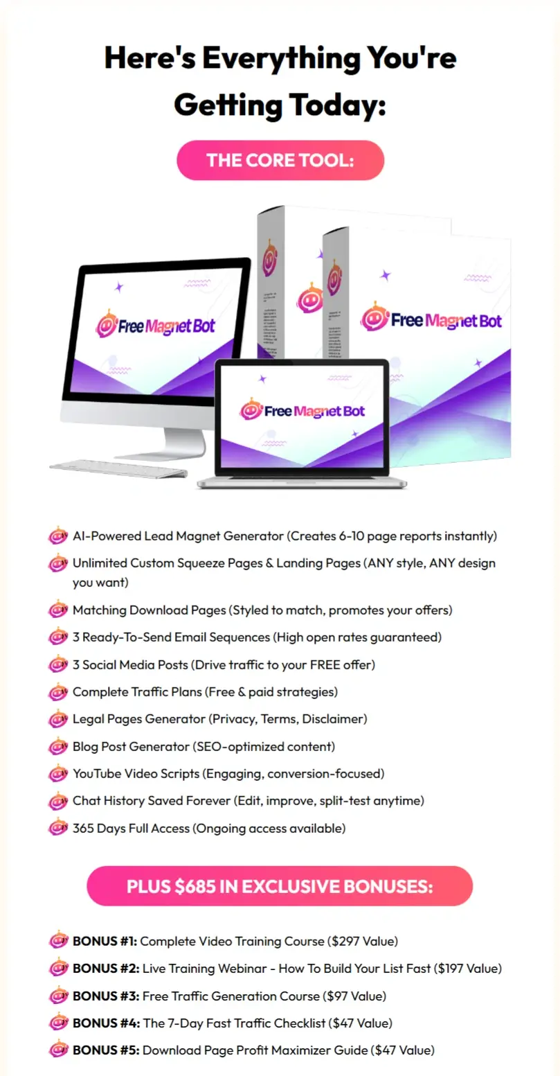 Free Magnet Bot is an AI-powered tool that helps online businesses attract subscribers and customers by offering high-value free resources. The system focuses on one powerful strategy: giving away the right “free” content that motivates people to join your list and engage with your brand.