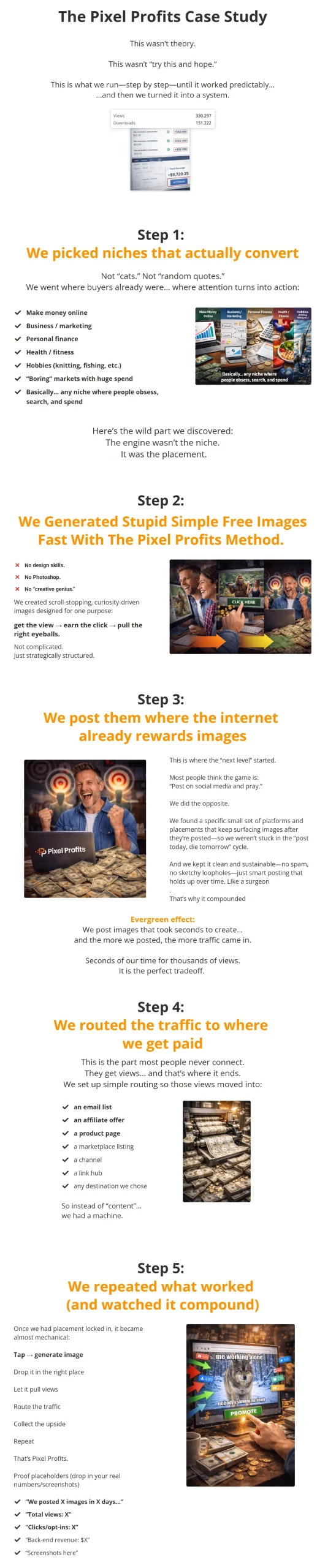 Pixel Profits is a traffic and monetization system built around AI-generated images and strategic placement.