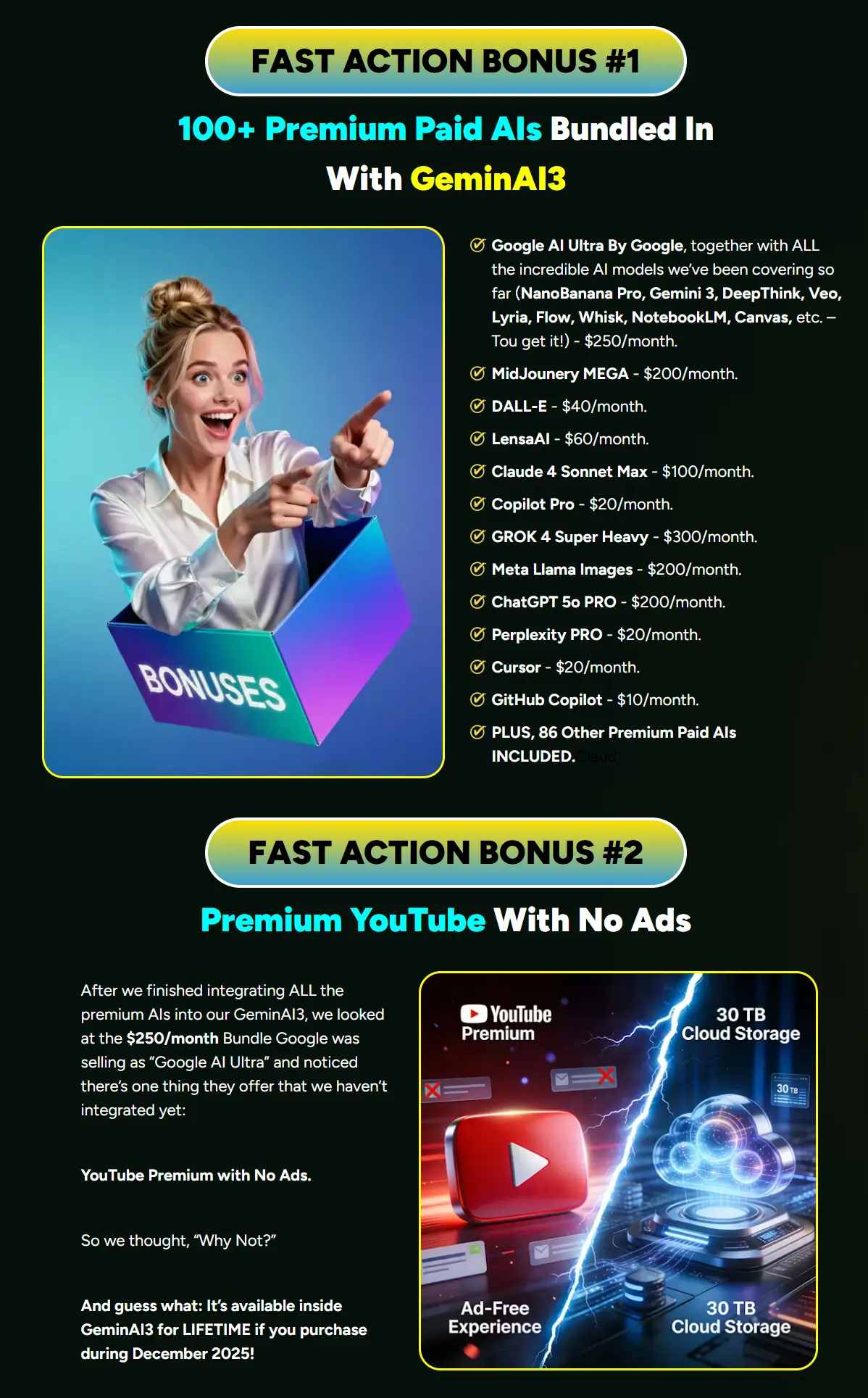 GeminAI3 promotes additional bundled benefits, including ad-free YouTube access and large-scale storage capacity for managing digital assets.