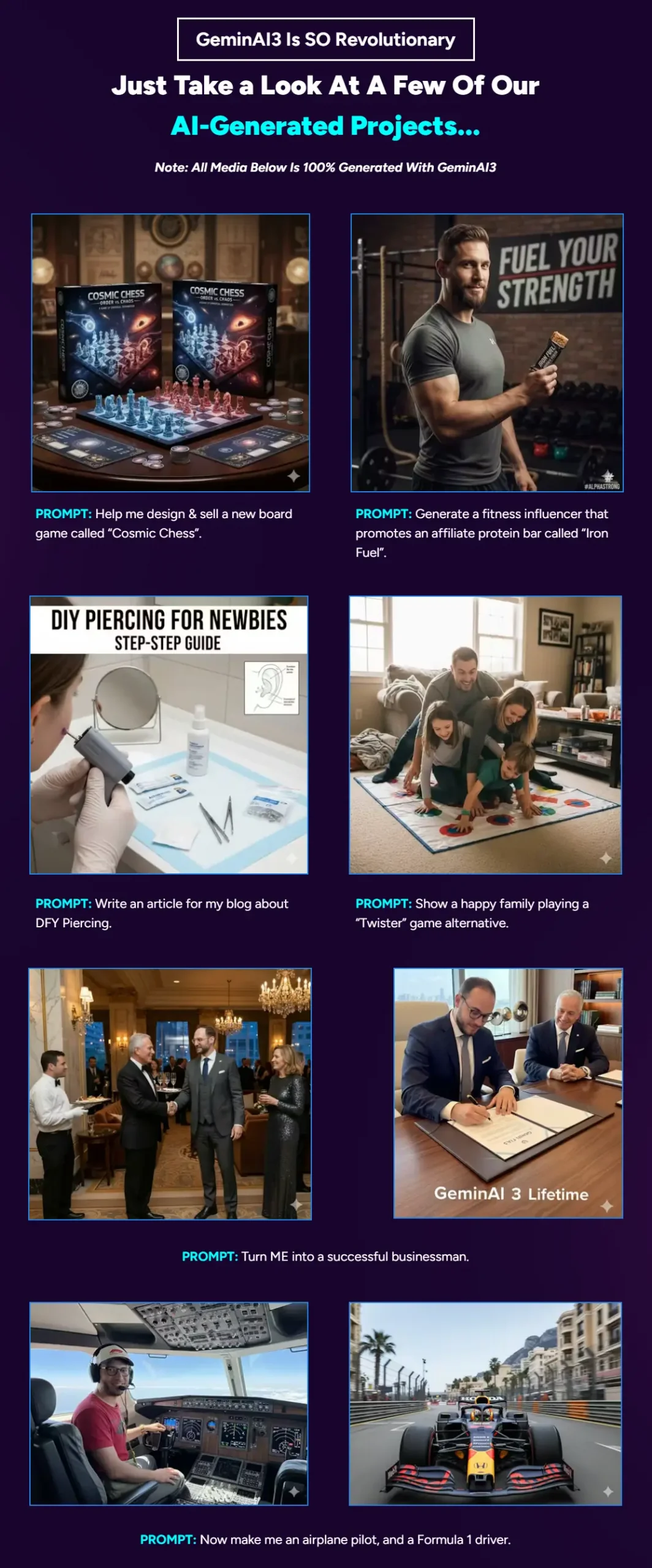With GeminAI3, users can generate unlimited images and graphics, edit existing visuals through text-based commands, and create niche-specific content such as social media visuals, mockups, and stock-style images. This streamlined approach makes the platform suitable for marketers, content creators, and small businesses that need visual assets quickly and consistently.