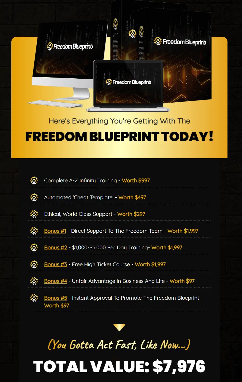 - Complete A-to-Z Freedom Blueprint Training. Gain instant access to step-by-step video tutorials designed for all skill levels—even if you’re a total beginner. This comprehensive training walks you through the entire process of setting up and scaling your online business, so you can simply follow along and copy what works.