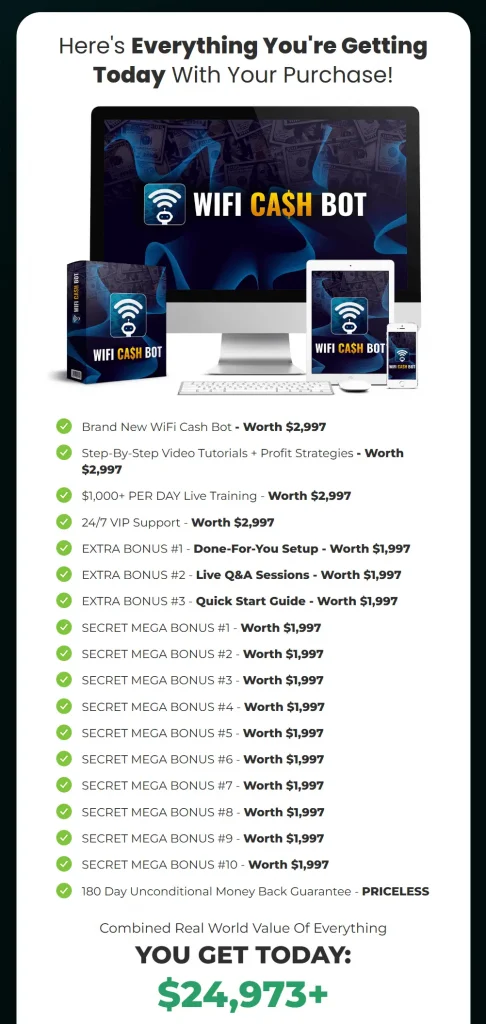 - WiFi Cash Bot App: You get access to WiFi Cash Bot, the only software and system you’ll ever need… Which makes us $250 per day in commissions!