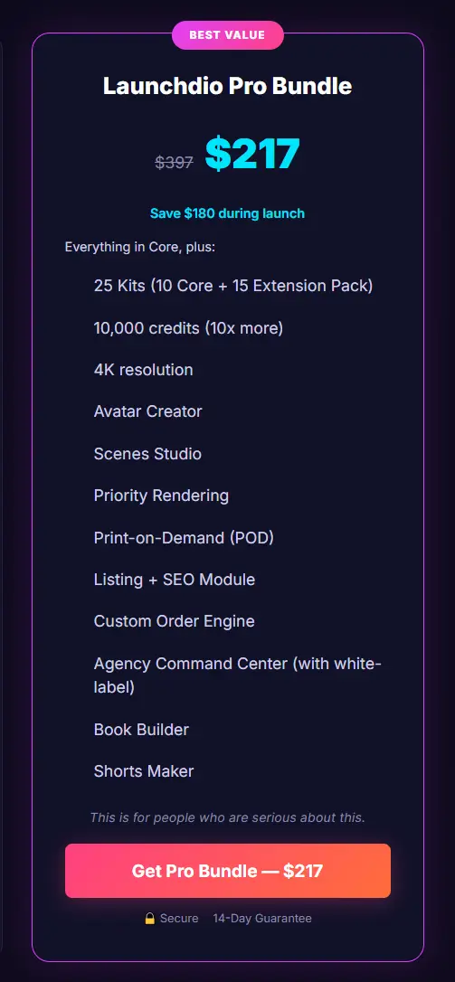 Launchdio AI Pro Bundle gives buyers the complete system, not just the basic toolkit. It includes 25 kits, 10,500 credits at launch, 4K output, priority rendering, and powerful business-focused upgrades such as the Print-on-Demand module, Listing + SEO Module, Custom Order Engine, Agency Command Center, Book Builder, and Shorts Maker.
