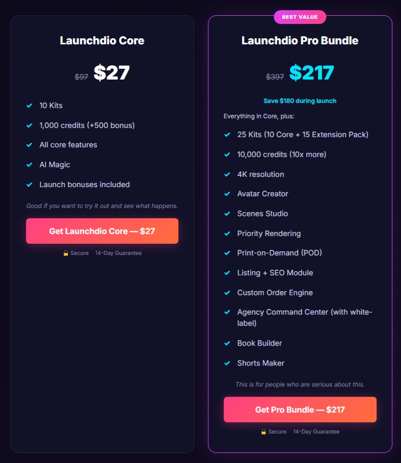 The Core version works well for testing the platform, but the Pro Bundle makes far more sense for anyone who wants to build faster, create more products, serve clients, and turn Launchdio into a real income tool.