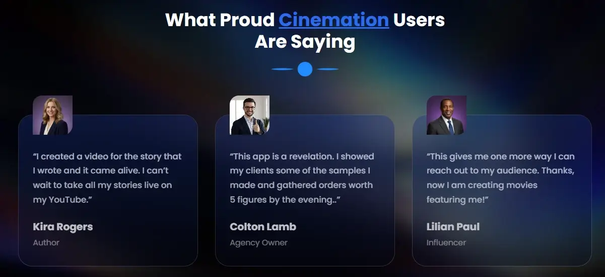Another standout point comes from the platform’s range of use cases. Cinemation targets creators, marketers, agency owners, influencers, educators, and storytellers. The page promotes applications such as dramas, promotions, episodic shows, movies, educational videos, biographies, ads, and narrations.