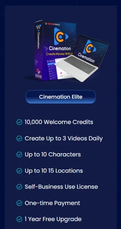 With this deal, you get access to Cinemation Elite + Pro + Reseller, along with premium tools like Freezur Pro for storytelling videos and TubeRank Jeet Pro for video SEO and ranking. You can create longer videos, use unlimited characters and locations, access multiple AI models, and even sell videos or resell licenses for profit.