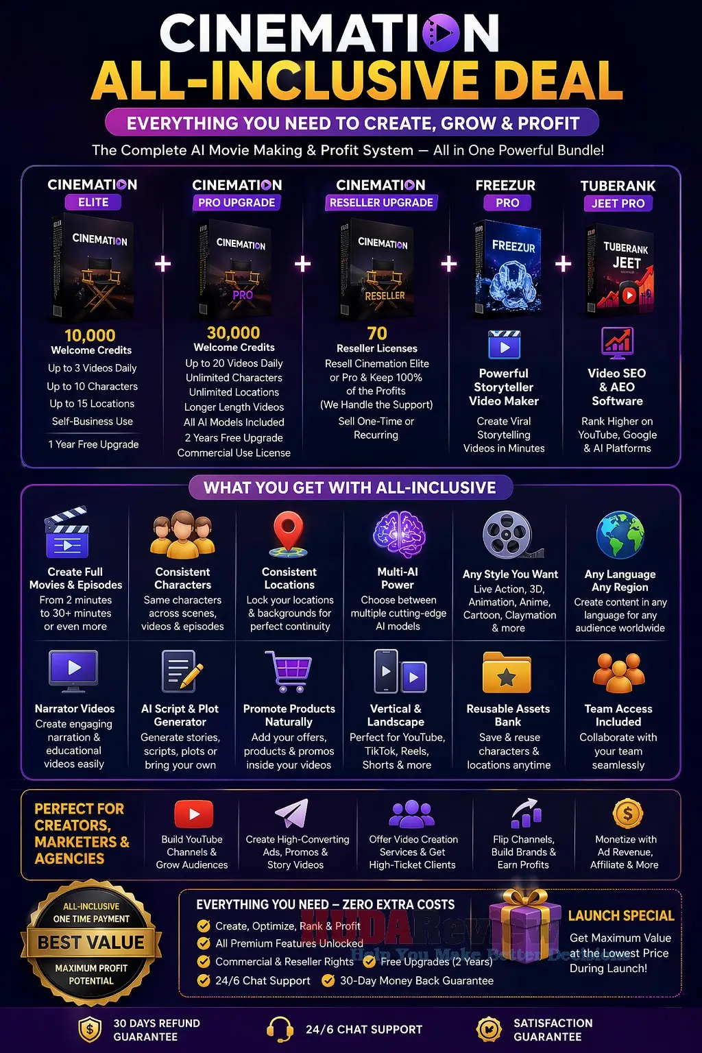 The Cinemation All-Inclusive Deal brings everything you need to create, scale, and monetize cinematic AI videos in one powerful package. Instead of relying on multiple tools, this bundle combines advanced video creation, storytelling, optimization, and monetization features into a single system designed for serious results.