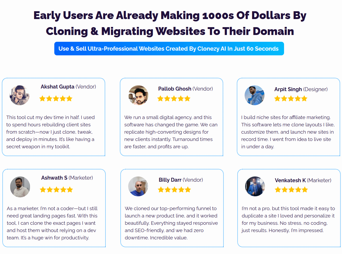 Clonezy AI harnesses the power of AI and clones the whole website on your domain in less than 60 seconds.  Publish these “high-in-demand” and make huge profits daily.