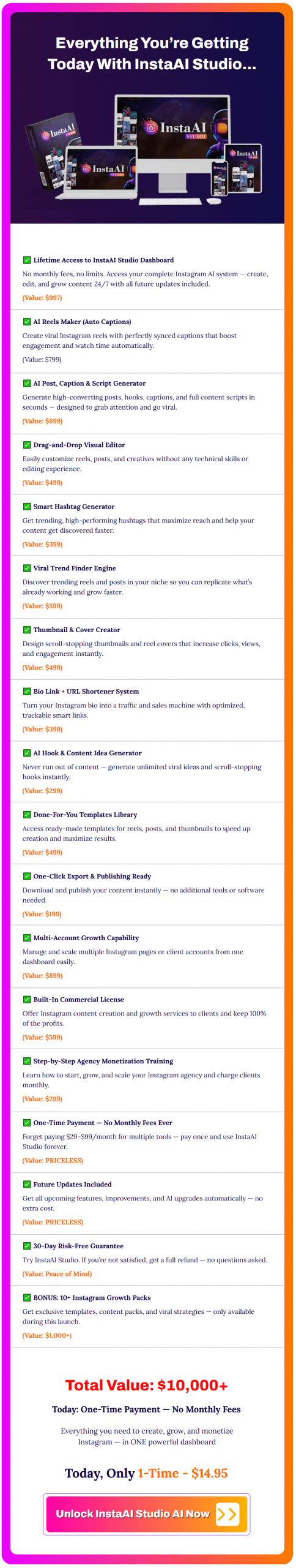 Overall, the $14.95 one-time price is easy to see as a strong deal. It is affordable, beginner-friendly, and backed by a 30-day refund policy, which makes trying InstaAI Studio feel far less risky.